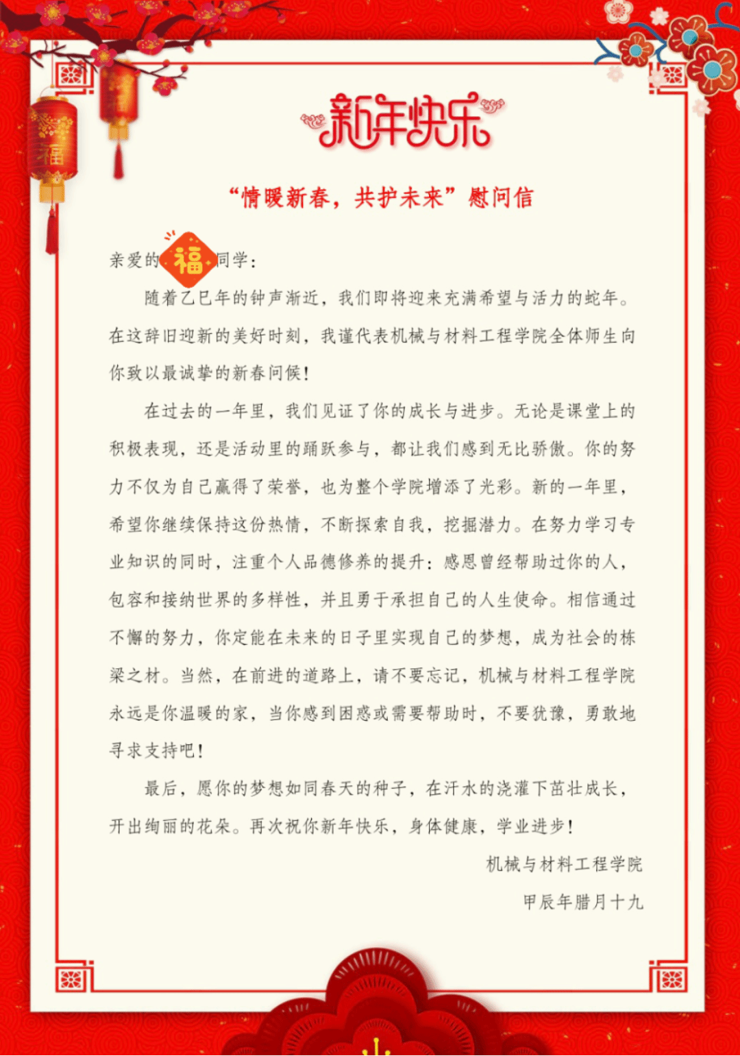 此次春节慰问活动增强了特殊群体学生的归属感和自信心,也是机械与材料工程学院持续开展资助育人工作的具体体现。未来,我院将继续有力落实党和国家的资助政策,精准助力学生成长成才。最后,愿所有同学都能度过一个欢乐祥和的新春佳节,迎接充满希望的新一年!