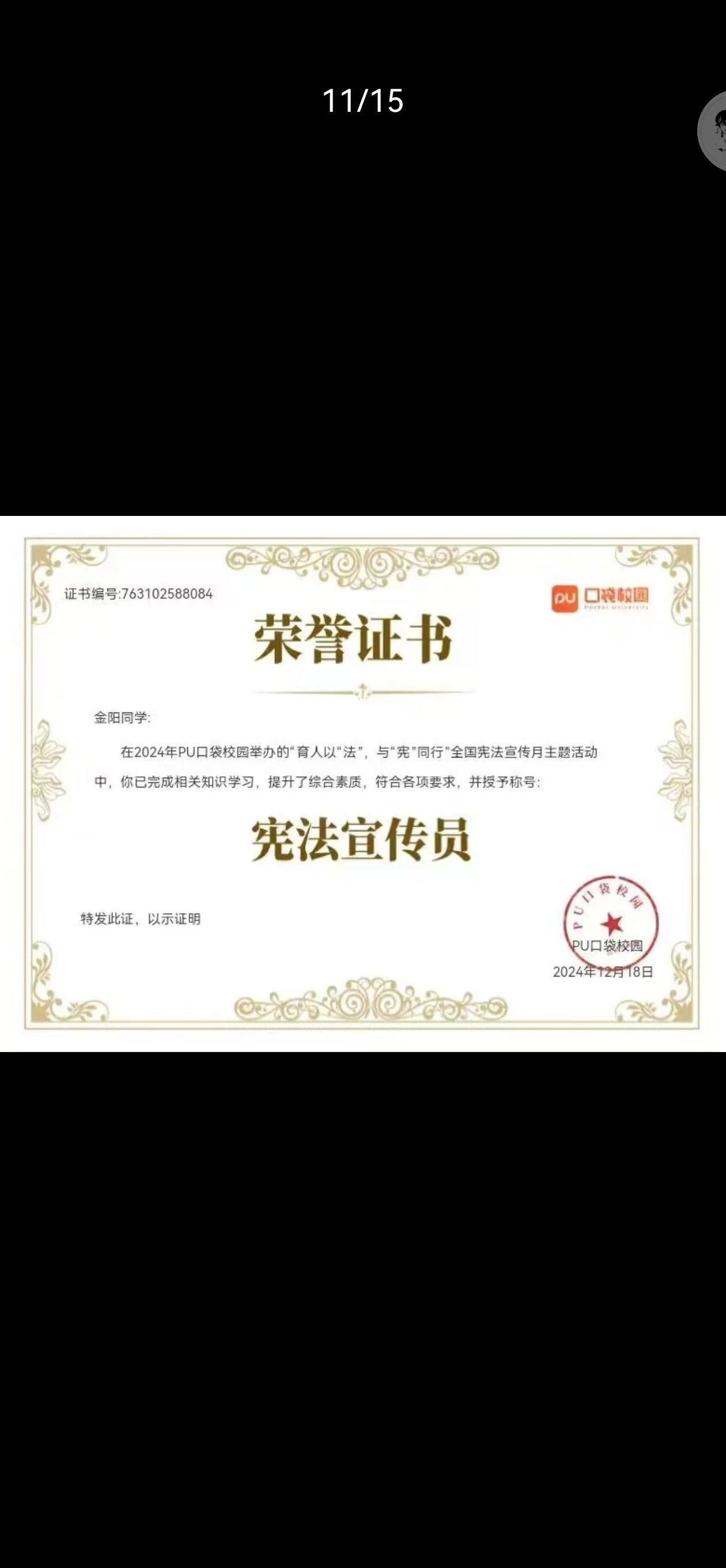2024年12月4日是我国第十一个“国家宪法日”。宪法是国家的根本大法,具有最高的法律效力。在全面依法治国的进程中,加强宪法教育对于增强大学生的法治观念、维护宪法权威至关重要。本次学习活动是以线上直播课形式开展,主讲人为中央社会主义学院教授马聪,课程内容为《宪法的渊源、效力及其意义》。同学们通过集体学习和个人学习完成后,即可获得PU口袋校园第二课堂3个学时和由PU口袋校园颁发的“宪法宣传员”荣誉证书。