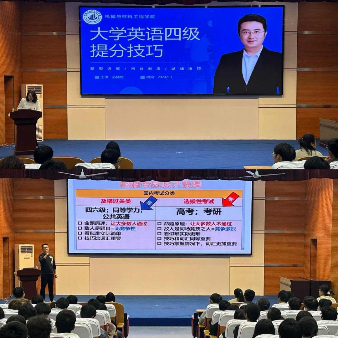 为帮助学生高效备战英语四级考试,提升英语综合运用能力,11月5日,机械与材料工程学院举办大学英语四级提分技巧名师讲座。本次讲座邀请了知名英语辅导老师,同济大学博士苏楠楠老师进行授课。