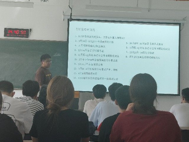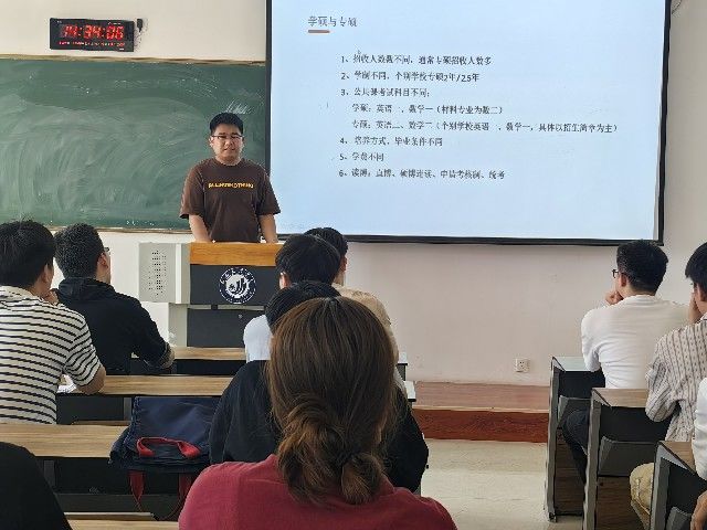 司逸伟结合自己的考研经历,从学硕与专硕差异、考研时间线、报名流程、院校选择、初试准备等相关内容进行了详细的讲解,强调要明确考研方向,合理正确地选择考研院校。最后,他围绕考研规划、备考场所、调整心态等方面对学生进行具体指导。互动环节,同学们与学长亲切交流,学长耐心地为大家答疑解惑,并鼓励考研学子持之以恒,不懈奋进。
