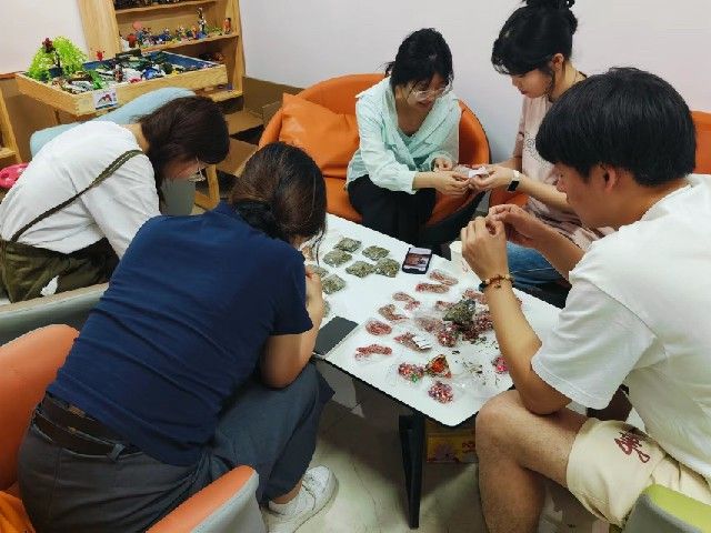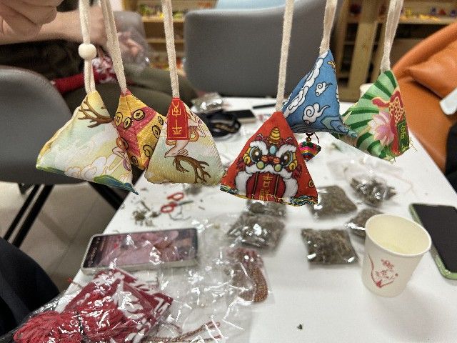 茶话会上,同学们巧动双手,从穿针引线到填充香料,共同体验了做香包、编彩绳、缠艾草锤等端午节传统活动,并彼此分享自己常用的减压方式。活动结束后,同学们将一个个制作精美的香囊赠予老师和朋友,送去安康幸福的美好祝愿。