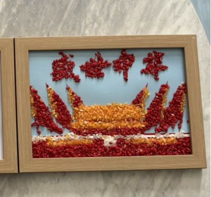 活动伊始,张佳婧介绍了五谷画的相关知识以及五谷作画的制作流程。五谷画是一种传统民间工艺,象征着五谷丰登、国泰民安,并且有着深厚的民族文化内涵。随后,大家用各类植物种子、七彩米、豆子等五谷杂粮,通过粘、贴、压、拼等手段,在纸板上进行创作。支部成员以五谷为笔画,以色彩作创意,献上《盛世中华》《石榴籽团结精神》《强国有我》《我和我的祖国》以及《有理想 有担当 能吃苦 肯奋斗》等精彩画卷,深情地表达对党的感恩之情和对祖国的美好祝愿。