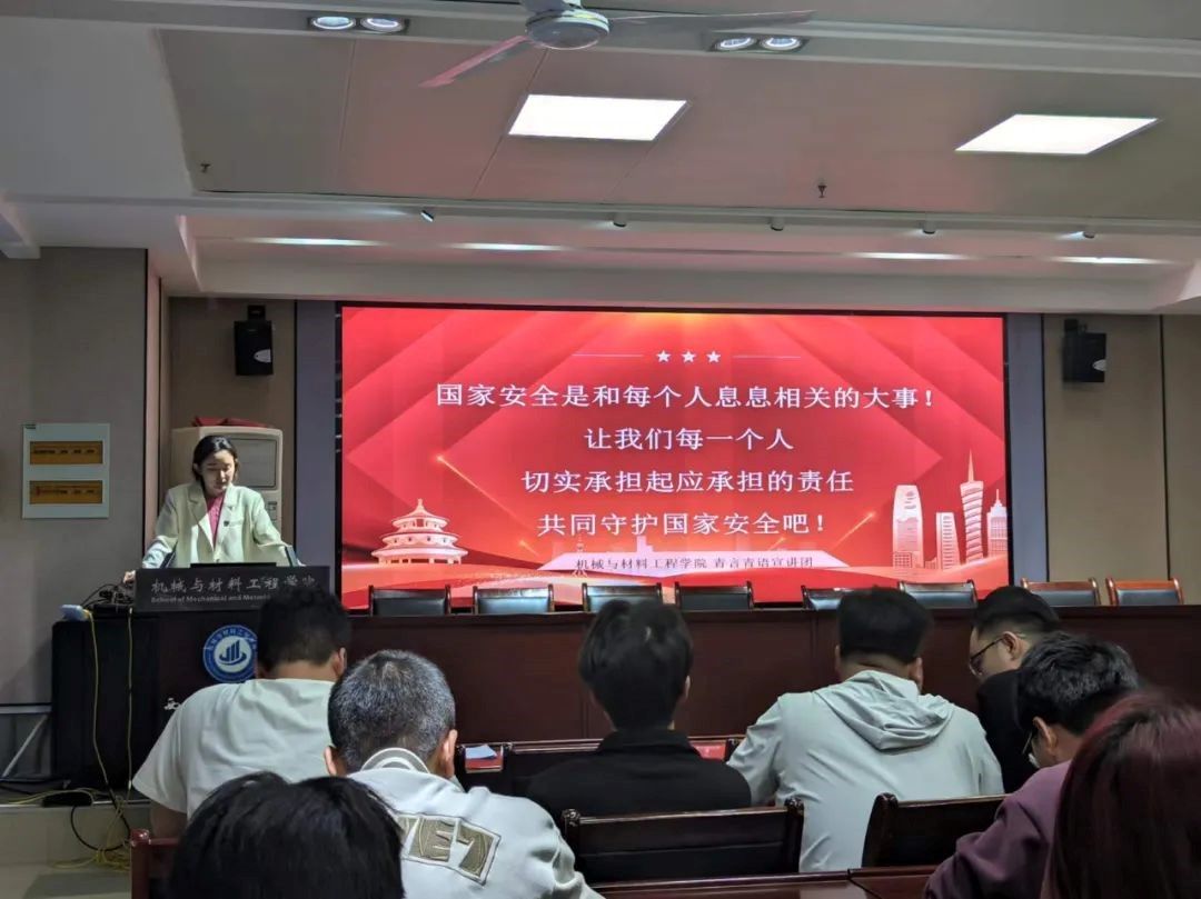 为进一步落实 “4.15”全民国家安全教育日宣传教育工作,党建引领凝聚爱国共识,筑牢国家安全青年防线,增强广大青年学生维护国家安全的意识和能力,4月16日,机械与材料工程学院青言青语宣讲团于实训楼204开展“国家安全记心间,筑牢安全青年盾”国家安全主题教育宣讲,学院全体在校学生党员、安全信息员参加。宣讲会由宣讲团指导老师戴玉珊主讲。