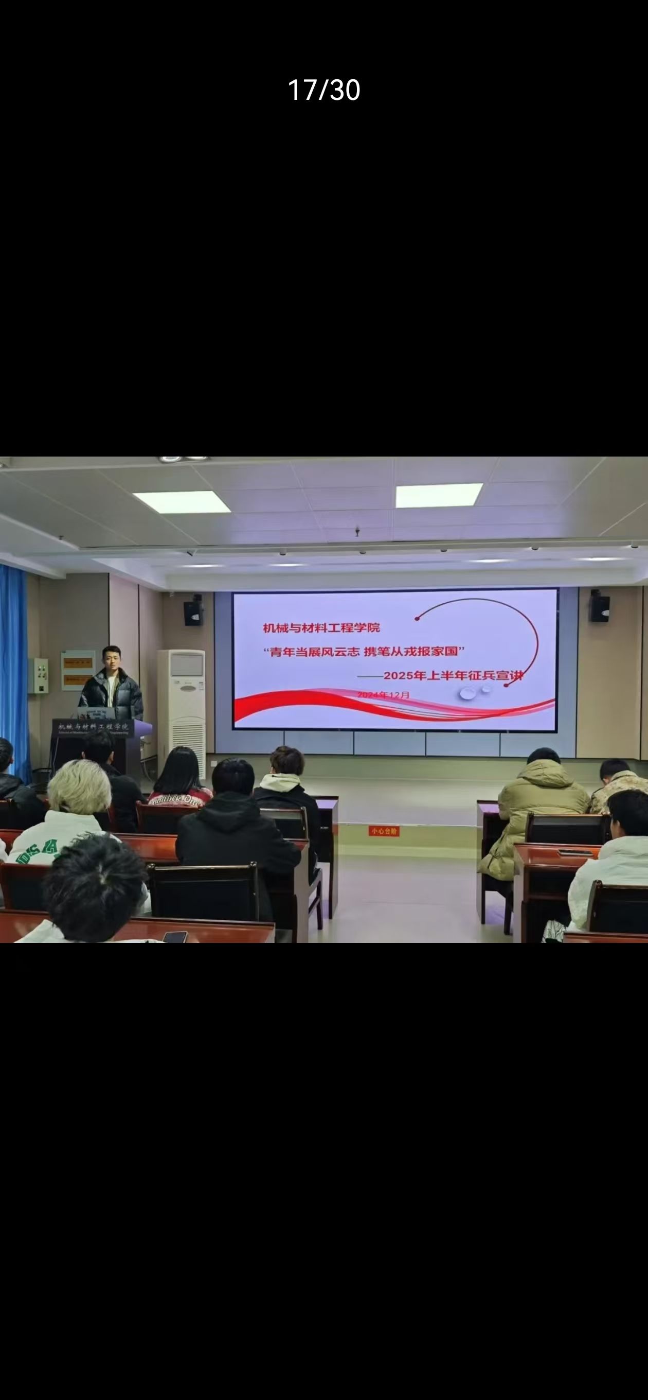 为深入贯彻习近平强军思想,响应国家征兵政策,做好相关征兵工作,激发机材学子参军报国热情,学院特成立由退役军人以及学生干部组成的征兵宣讲团,12月6日学院举行了“青年当展风云志 携笔从戎报家国”征兵宣讲会,本次会议由征兵专责张佳婧主持,百余名符合入伍条件的学生以及学院征兵宣讲团成员参加宣讲会。