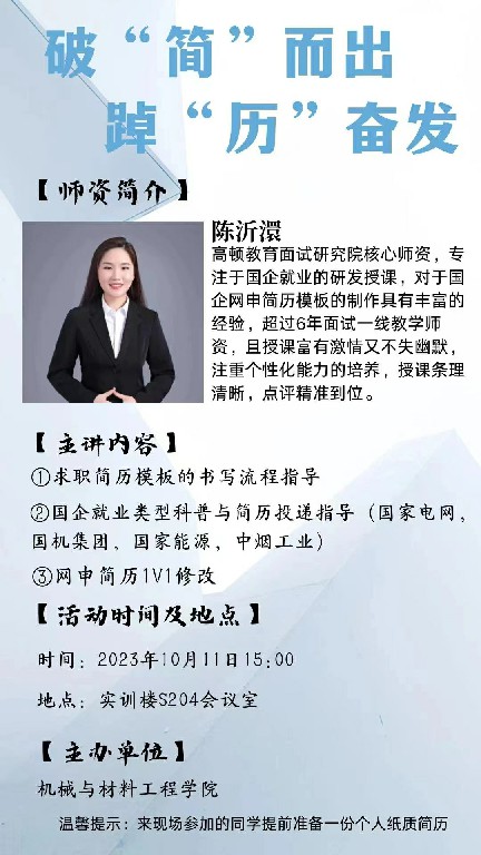 为进一步提升毕业生简历制作水平,持续加强毕业生求职竞争力,实现更充分高质量就业,我院特邀请高顿教育集团陈沂澴老师结合当前就业形势政策,围绕“破‘简’而出,踔‘厉’奋发”活动主题开展毕业生就业简历指导专题讲座,欢迎全体毕业生积极参加!