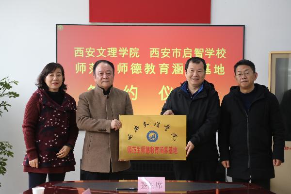 12月3日下午,我校师范学院、信息工程学院与西安市启智学校共建师范生师德教育涵养基地签约挂牌仪式在启智学校举行,西安市启智学校校长李唯宇、党总支书记韩秦虎、师范学院院长郭涛、信息工程学院党总支书记葛翠玲、师范学院副院长王华、信息工程学院副院长张力宁及师生代表参加了仪式。