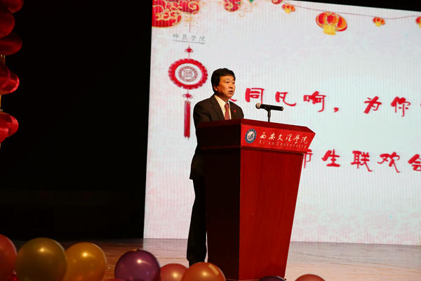 流光溢彩迎新年,心心相连齐飞扬。12月30晚7点,师范学院“不同凡响,为你写‘师’”师生联欢会在大礼堂拉开帷幕。出席此次迎新晚会的有学校副校长耿占军,学生处处长袁卫敏,师范学院院长王志强、党总支书记张军学、副院长查毅、副书记李昉、副院长蔡军、曹莹、刘倩倩以及师生代表千余人一同参加了活动。