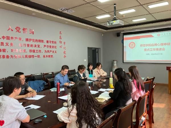 2024年4月17日下午14:30,师范学院召开应用心理申硕工作推进会。会议全面梳理了应用心理申硕专业学位点建设目标,落实建设责任任务,进一步明确了应用心理学学科建设工作重点。师范学院与学前师范学院的的应用心理学专业团队教师出席了本次推进会。