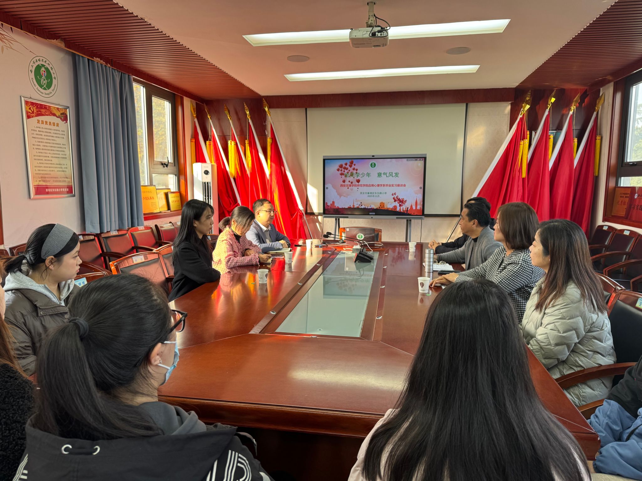 东仪路小学校长张伟、副校长朱峰及相关职能部门负责人热情接待并组织了座谈。张伟校长对我校12名应用心理学专业实习生的综合表现给予了充分肯定,并系统介绍了该校心理健康工作以及对实习生的指导模式,校方表示,将以雁塔区心理健康分中心成立为契机,进一步深化学生心理健康教育与家校协同育人工作。同时,实习单位对我院实习管理、人才培养等方面提出了宝贵的意见和建议。