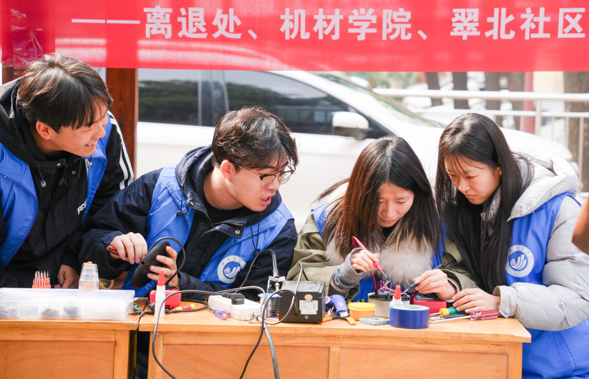 活动现场暖意融融、秩序井然。机材学院师生志愿者发挥专业优势,设立义务维修点位,为居民免费检修豆浆机、电饭煲、热水壶等小家电,细致排查故障、熟练维修保养,还现场普及家电安全使用知识。