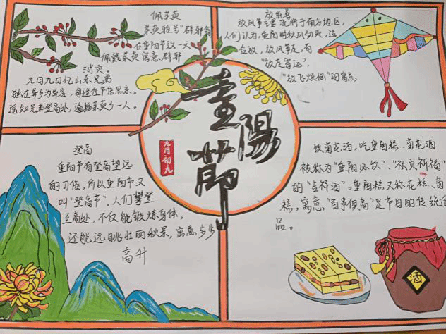 一张张手抄报,或描绘遍插茱萸、登高望远的重阳图景,或书写“老吾老以及人之老”的经典箴言,或记录与长辈相处的温暖瞬间。每一笔、每一划,都饱含着同学们对传统节日的理解;每一种色彩、每一个图案,都承载着对长辈最纯粹的敬爱。经过层层筛选,一批主题鲜明、创意独特、制作精美的优秀作品脱颖而出,现将部分佳作展示如下,与大家共赏这份重阳限定的温暖与感动。