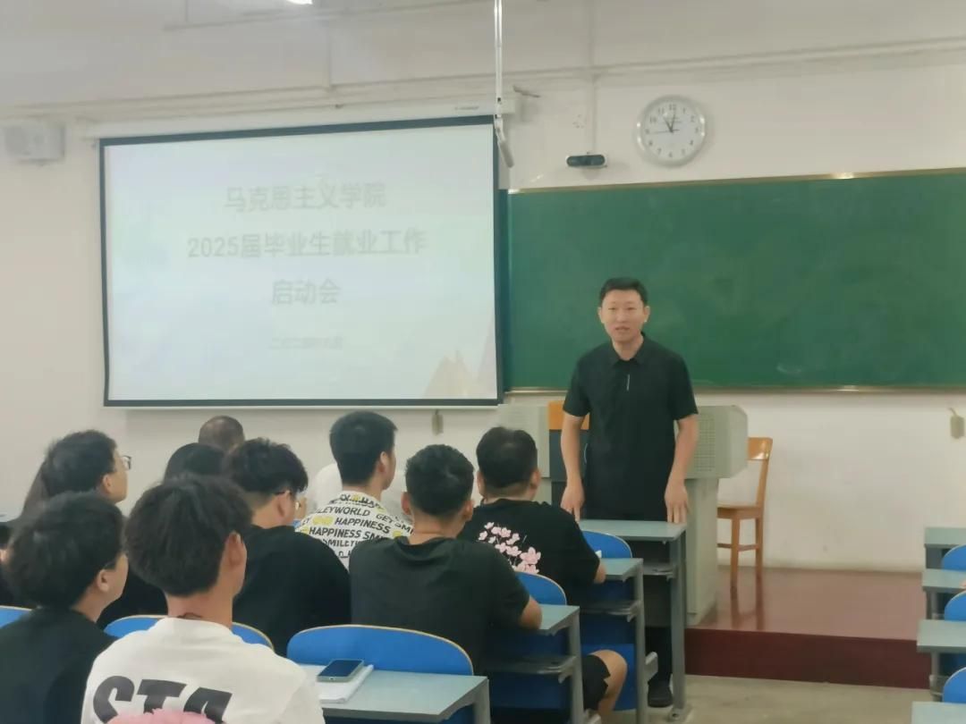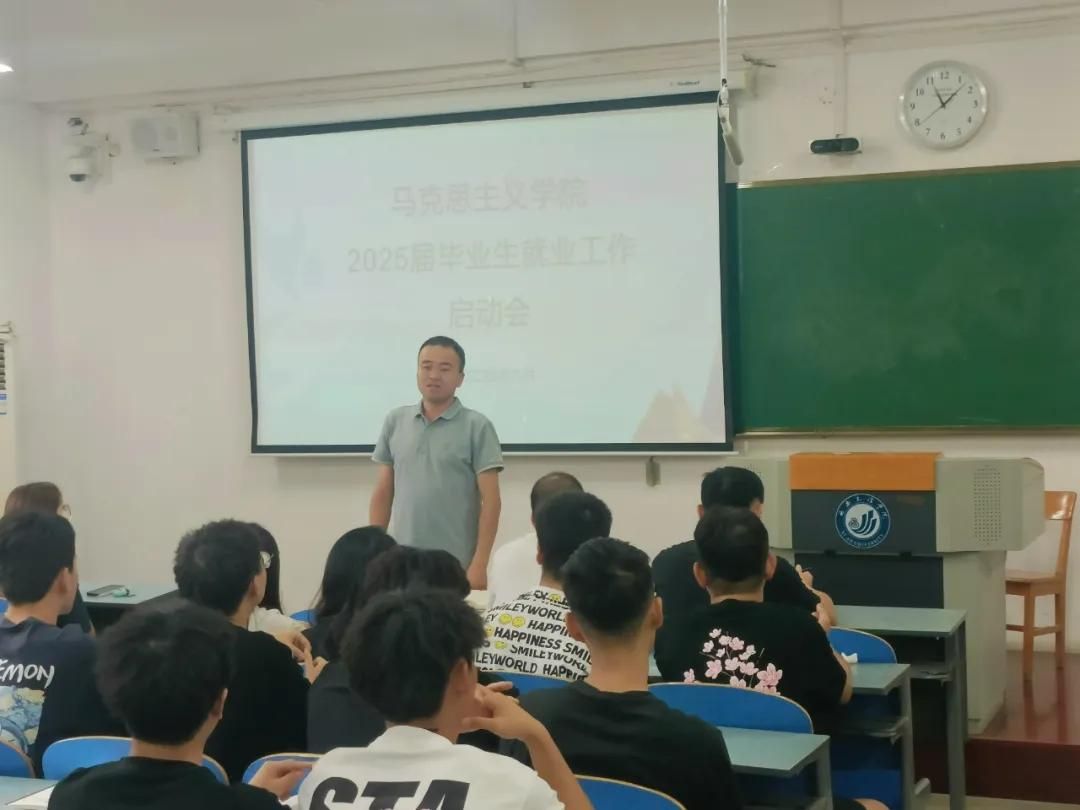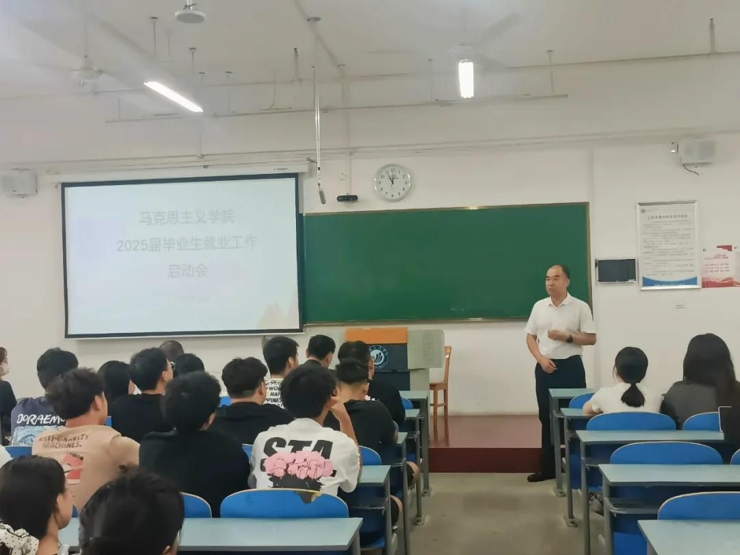 为做好2025届毕业生就业指导服务工作,帮助学生认清严峻的就业形势,合理规划就业目标,进一步提升毕业生求职意识和就业能力,提早进入备战状态,马克思主义学院于9月5日在明德楼B0223组织召开了2025届毕业生就业动员大会。出席会议的有马克思主义学院院长刘维春、教学副院长申晓玲,就业帮扶单位部门领导悉数到场,他们是校宣传部部长田建邦、纪委综合室主任王磊、招生就业处副处长李小勇,马院2025届全体毕业生参加了本次活动,会议由党总支书记刘永平主持。