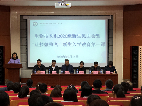 10月14日下午,我院生物技术系在图书馆报告厅举行2020级新生见面会暨“让梦想腾飞”新生入学教学第一课。生物技术系校友、我校培训中心主任孙建龙,著名书法家、师范学院副院长马伟,彩虹星球文化科技有限公司创始人王来库董事长,学院全体班子成员,生物技术系全体教师和2020级所有新生参加了此次见面会。会议由生物技术系主任何凤琴主持。