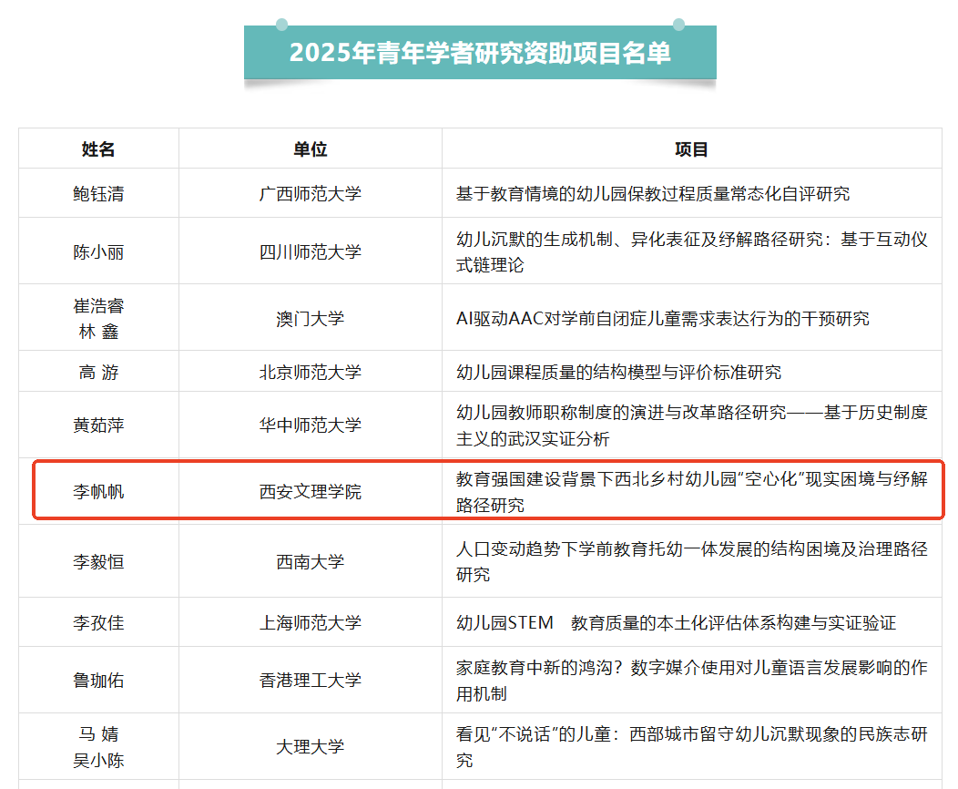 10月23日,奕阳教育研究院公示2025年青年学者研究资助项目名单,我院李帆帆博士主持的《教育强国建设背景下西北乡村幼儿园“空心化”现实困境与纾解路径研究》获批立项。本次资助项目共收到来自全国各地区及美国、澳大利亚等80余个高校、研究机构、幼儿园青年学者提交的140份项目申请书。评审环节采用严格评分制,经终审综合评定,最终仅22个项目获得资助,西部地区仅立项7个。本项目立项不仅彰显了该研究在西北乡村学前教育领域的现实价值,更体现了评审专家对我院科研实力与学术水平的高度认可。