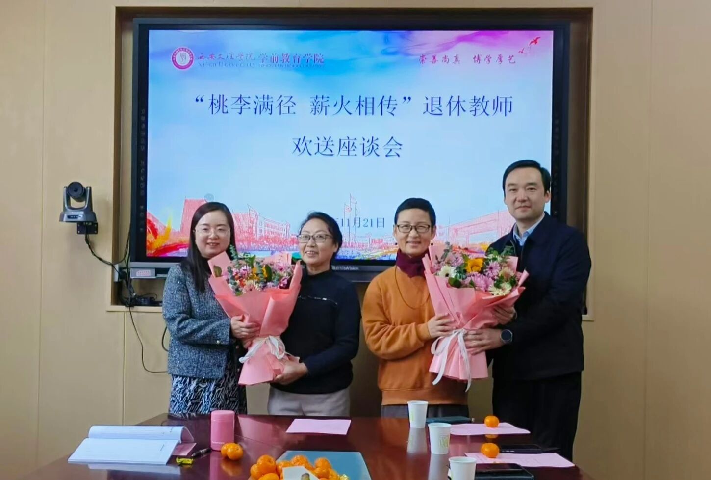 11月21日,初冬暖阳浸润校园,学前教育学院H208会议室内暖意融融。学院为深耕教坛三十余载的姚晓燕、谢红梅老师举行温馨而隆重的荣休座谈会,学院领导班子、退休教师、师生代表齐聚一堂,以最真挚的情谊致敬两位老师的耕耘岁月,以最殷切的期许接续教育薪火。座谈会由副院长雷巧娟主持。