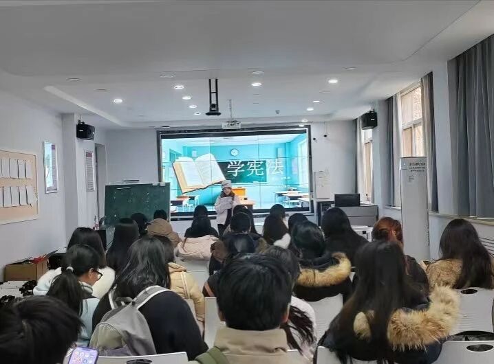 晨光中,全体2025级新生齐聚班级,开展“晨读悟宪”活动。同学们手持宪法节选读本,齐声诵读公民基本权利与义务、国家机构等核心条文,朗朗书声传递着对宪法的尊崇。诵读后,学生代表结合专业发言:“作为未来的幼师,我们不仅要自身懂法守法,更要把宪法精神转化为幼儿能理解的语言,在日常教学中播撒法治种子。”沉浸式体验让宪法条文从文字转化为内心认同,更明晰了法治启蒙教育的职业使命。