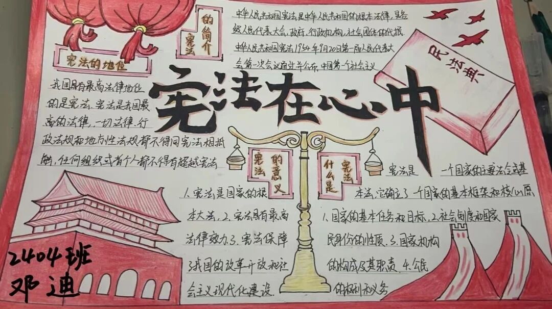 宪法是治国安邦的总章程,更是未来幼师践行职业使命的根本遵循。为让宪法精神深度融入校园生活与专业成长,我院以“宪韵润心,法伴幼行”为主题,聚焦主题班会、集体晨读、手抄报创作及心得分享四大核心环节,通过互动式、沉浸式、特色化的教育形式,让宪法知识与专业实践深度融合,引导同学们在参与中体悟法治内涵,明确未来幼师的责任与担当。