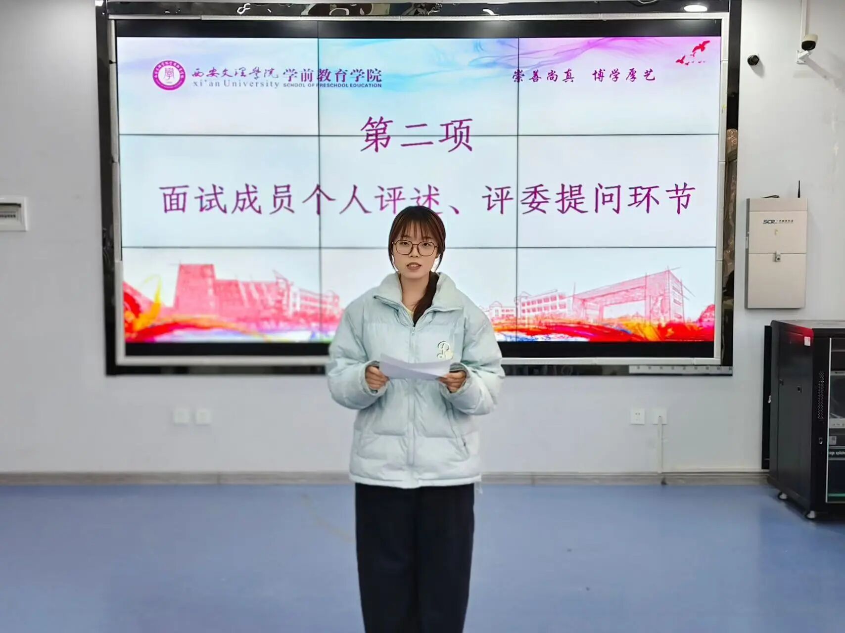 进入面试考核环节,参选同学依次进行个人陈述,评委老师们根据同学们的表现进行针对性提问,从宣讲思路、表达能力等多个维度进行综合考评。同学们从容自信的表达、富有创意的宣讲设计,展现了学前学子的青春风采与专业素养。