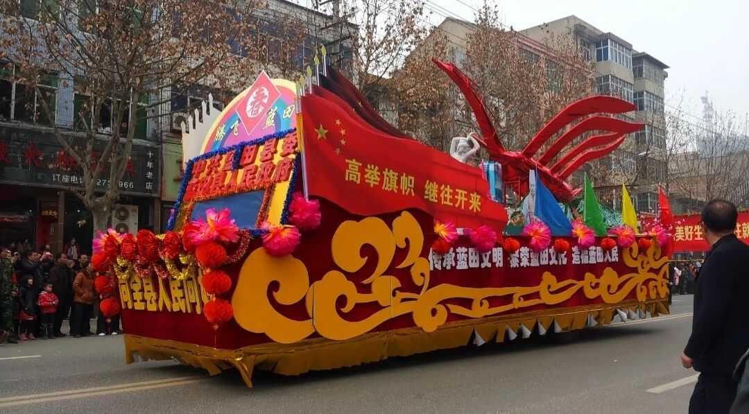 蓝田县社火作为省级非遗民俗盛宴,在正月持续焕发热度,成为当地新春最具辨识度的文化符号。如今常汇聚多村队伍开展大型巡游,这是几年前的蓝田社火表演照。正如图片所示,巡游现场氛围感拉满:身着红金盛装的锣鼓队奏响铿锵鼓点,为队伍开道;装饰着祥云纹样与红色绸带的彩车气势恢宏,承载着文化传承的标语缓缓前行,蓝田社火也在传承中焕发新生。