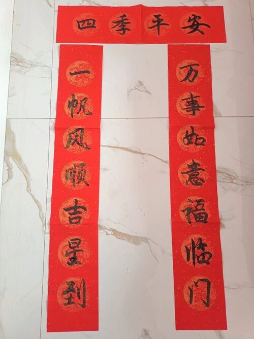 本作品选用红底洒金宣纸,红红火火的色调很有新春氛围。内容上选择了“一帆风顺吉星到,万事如意福临门”,搭配横批“四季平安”,都是贴合丙午马年、朴素又真诚的吉祥话。