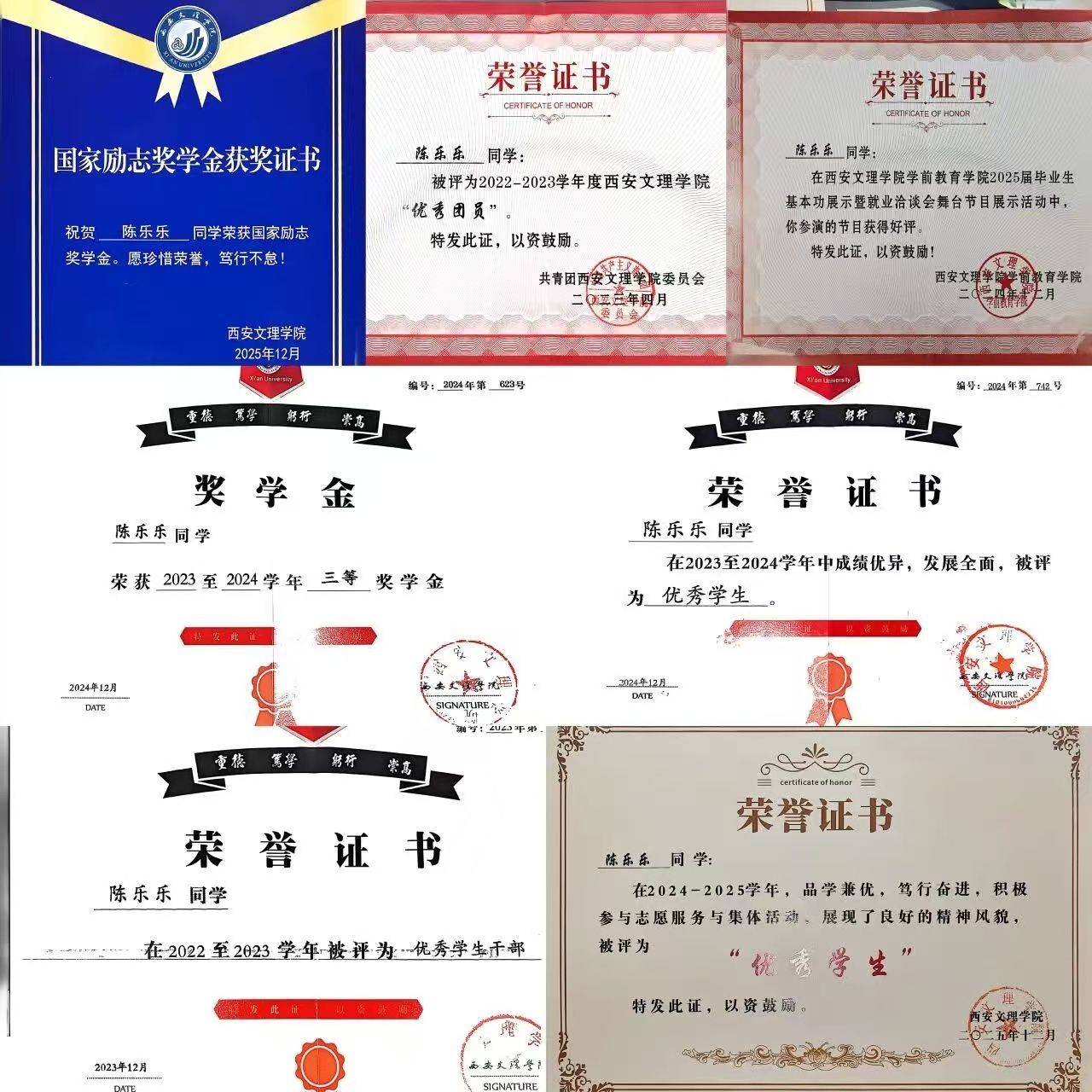 在专业学习上,陈乐乐同样没有松懈,连续三年智育及综合测评排名稳居年级前列,先后考取了幼儿园教师资格证、普通话二级甲等证书,并通过了英语四级考试。连续两年获得校级优秀学生奖学金,这些荣誉见证了她一步一个脚印的努力。“学习是一场马拉松,不是短跑。”她常常用这句话提醒自己。在她看来,每一次考试、每一张证书,都是通向理想职业的一块基石。