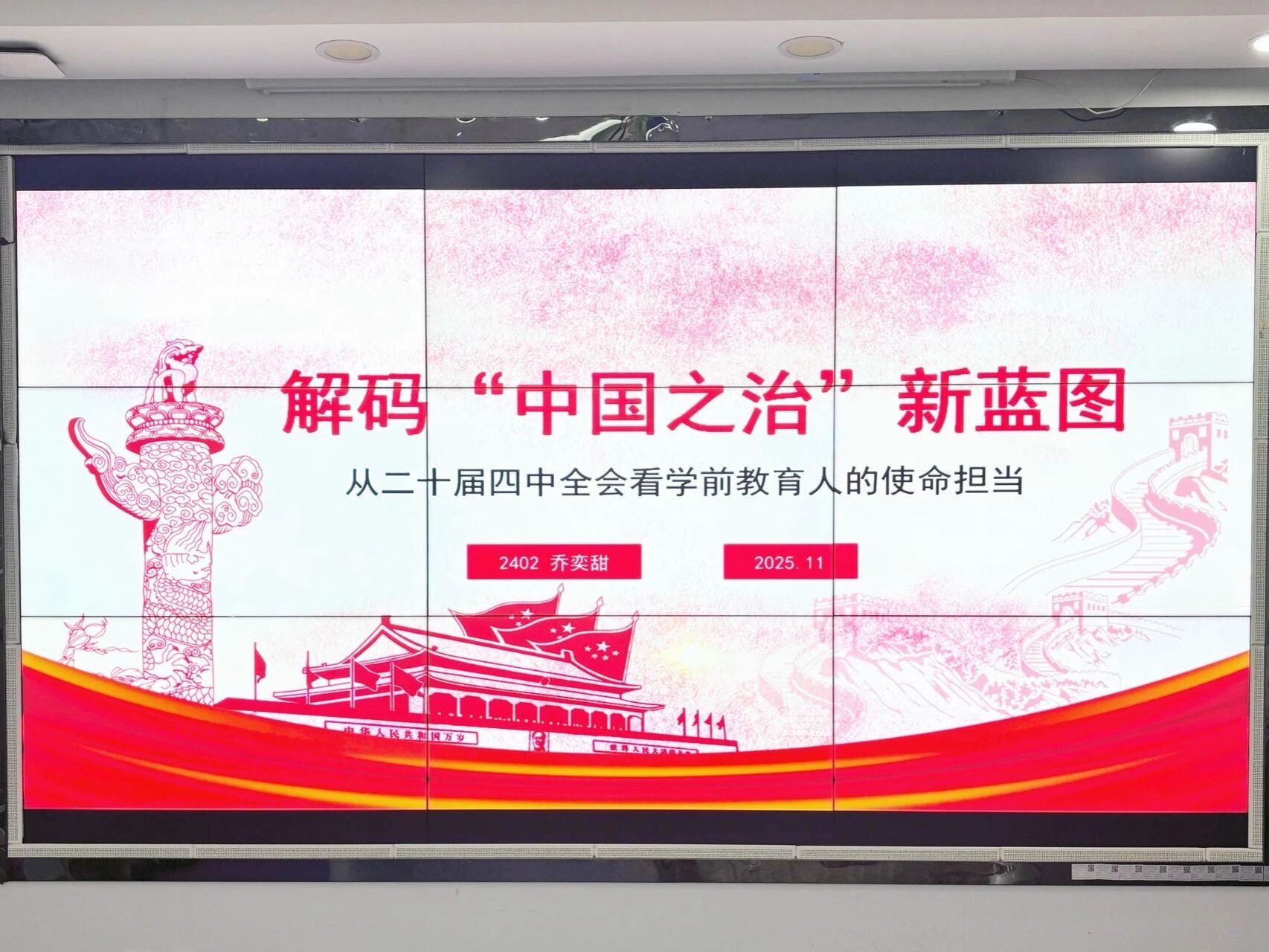 为深入探讨“中国之治”与学前教育的深刻联结,推动党的二十届四中全会精神在青年学子中落地生根,学前教育学院学生党支部于11月17日晚19时在弘文楼H0201举办了“党的二十届四中全会精神解读”系列微党课。本次党课由乔奕甜同学主讲,在理论深耕与实践分享中,明晰新时代学前教育人的使命与担当。