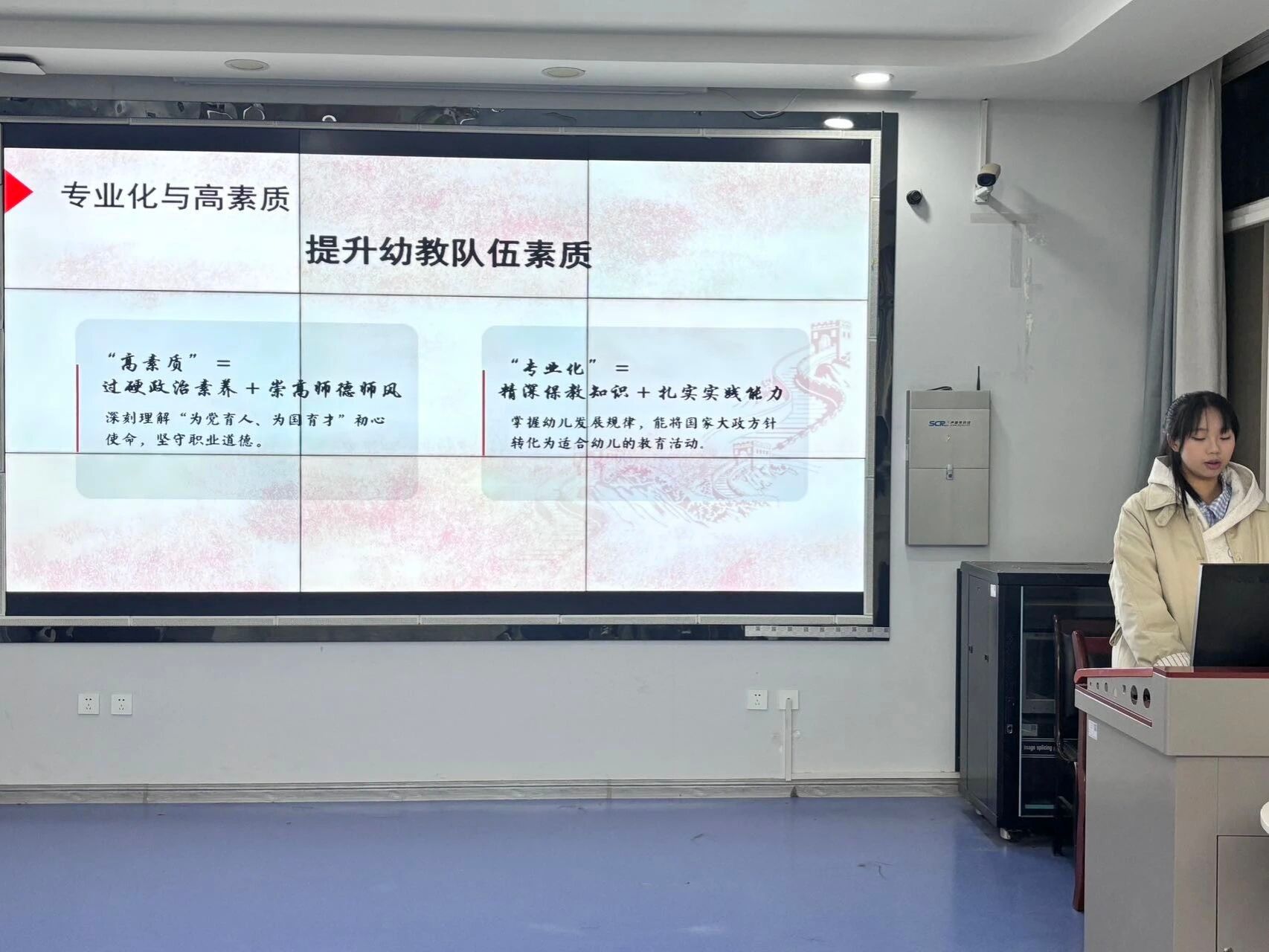 最后,乔奕甜将话题聚焦于“学前人的行动答卷”。她指出,全会精神不是挂在嘴边的口号,而是融入日常的行动指南。作为 “未来幼师”,“高素质、专业化”是我们的立身之本。要牢记“立德树人”根本任务,把家国情怀、规则意识、合作精神藏进每一次绘本讲解的温情里,融入每一场游戏引导的互动中。她呼吁“小幼狮”们将国家治理的宏大叙事化作幼教日常的细微实践。