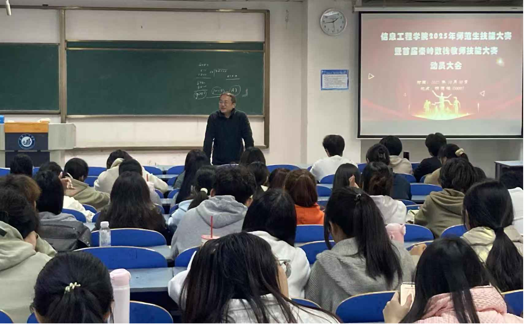 数学系召开2025师范生技能大赛暨首届秦岭数栈教师技能大赛动员大会 为精准锚定赛事核心、明晰备赛路径,10月30日中午,信息工程学院数学系在明德楼D0005召开师范生技能大赛动员会。数学系主任王挺、秦岭数栈卓越教师创研中心主任于丽芳,副主任崔一民与全体同学齐聚现场,共启新程。 于丽芳老师详细介绍了大赛的核心目的与各分赛项要求,鼓励大家以赛促学、以赛促练,为参加更高级别赛事稳扎根基,同学们对备赛节奏、参赛方向有了清晰规划与明确方向。随后,崔一民老师强调,师范生技能大赛既是检验学习成果的试金石,...
