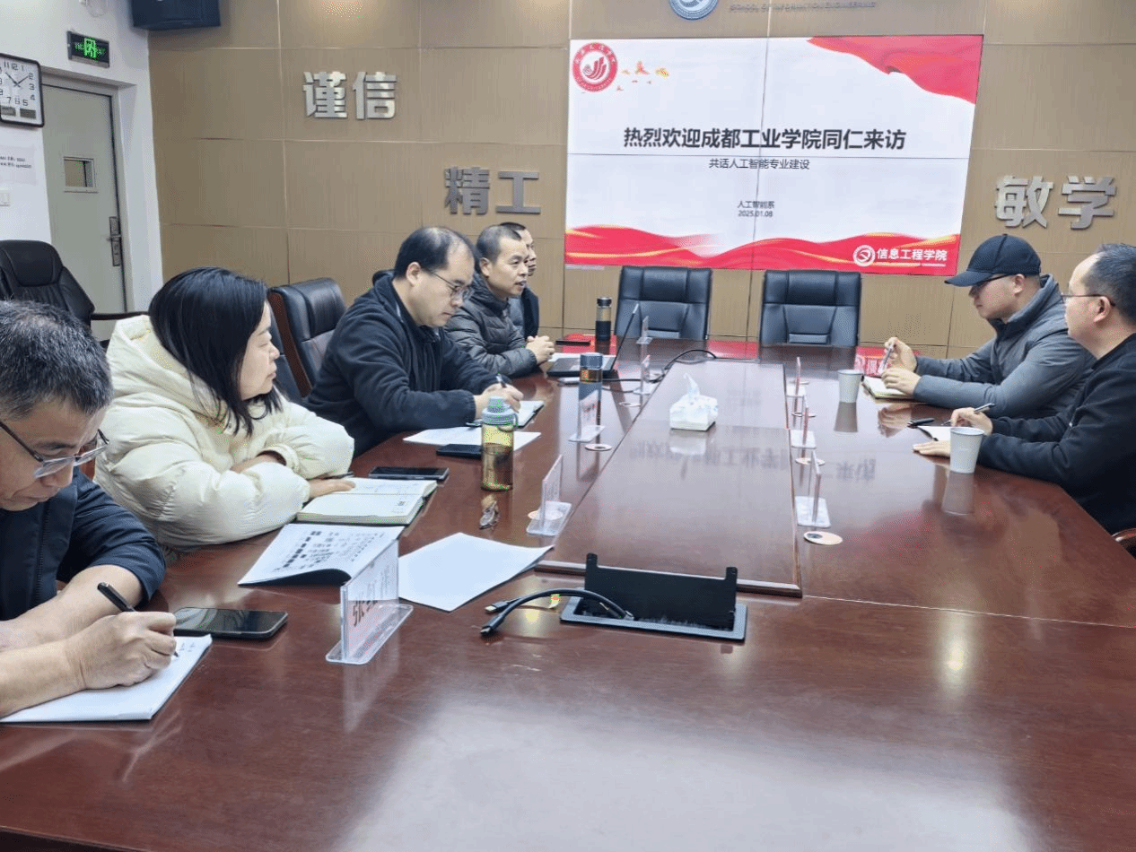 信息工程学院与成都工业学院共话AI人才培养 1月8日上午,成都工业学院大数据与人工智能学院秦飞龙、朱虹锦老师一行莅临信息工程学院,就人工智能专业建设开展交流研讨。双方重点围绕人才培养方案的优化、学生就业指导策略以及通识课程的设置与融合进行了深入探讨。交流中,双方坦诚分享了各自在教学改革与产教融合方面的经验与思考,现场气氛热烈融洽。此次座谈不仅加深了两校之间的友谊,更为双方在人工智能专业建设上提供了宝贵的借鉴与新思路。通过思想的碰撞与经验的互通,...