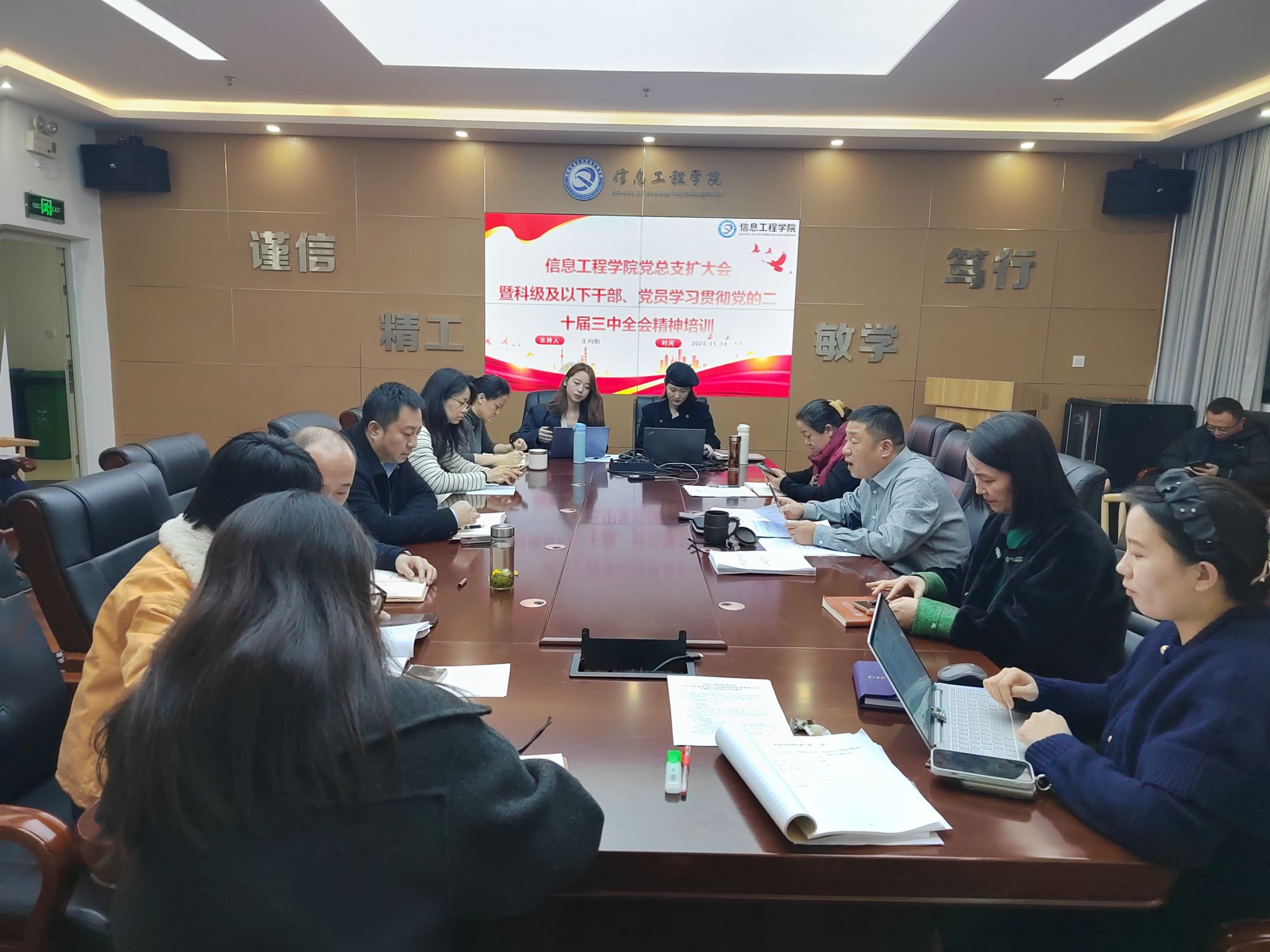 为深入学习贯彻习近平新时代中国特色社会主义思想,全面深刻领会和贯彻落实党的二十届三中全会精神,11月14日,信息工程学院党总支召开党总支委员(扩大)会暨科级及以下干部、党员学习贯彻党的二十届三中全会精神专题学习会。会议由党总支书记王向阳主持,党总支全体委员、科级及以下干部、党员参加了会议。