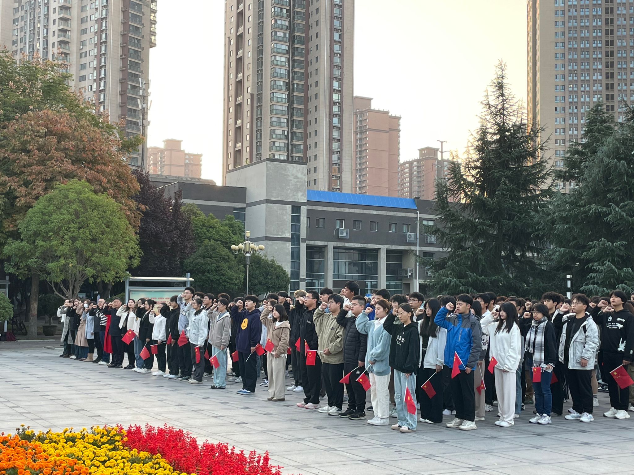 升旗仪式在庄严而神圣的氛围中缓缓拉开帷幕。校国旗护卫队以矫健的步伐,护送着五星红旗迈向升旗台,每一步都凝聚着对祖国的无限敬仰。随着指挥员响亮的口令,五星红旗在雄壮激昂的国歌声中缓缓升起,迎风招展,熠熠生辉。全体师生肃立,目光紧随国旗的轨迹,心中激荡着对祖国的深情厚谊,共同奏唱国歌,歌声嘹亮,响彻云霄,彰显出学院师生深沉的爱国情怀和坚定的理想信念。