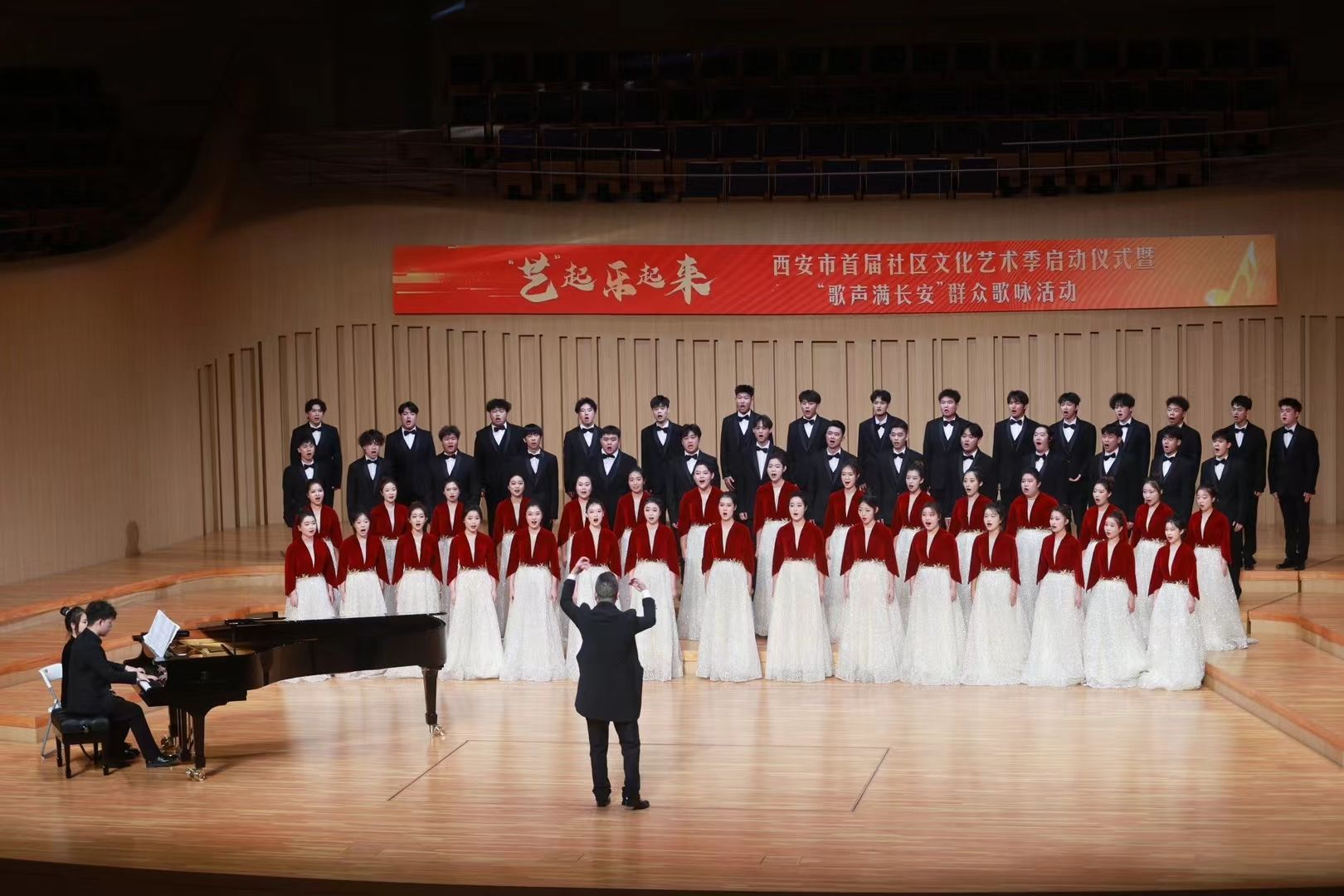 西安市首届社区文化艺术季于8月30日在长安乐·一带一路文化艺术中心隆重开幕,活动以“歌声满长安”群众歌咏活动作为激动人心的启动仪式,我院麒麟合唱团混声合唱表演混声合唱《天路》以9.856的高分获得二等奖第一名。也是合唱团成立两个月以来第一次参加专业大赛,此次比赛也是全省影响最大,水平最高的合唱大赛。共有十六支高校专业和社会队伍参加。