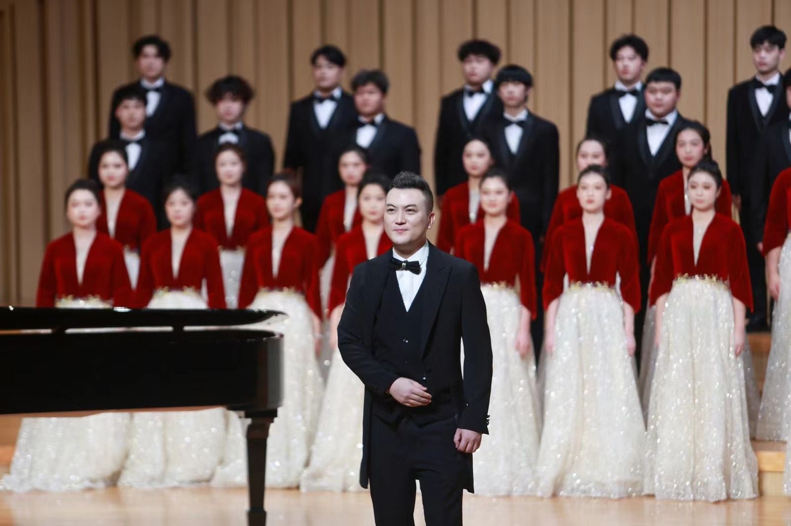 麒麟合唱团混声合唱《天路》是由我院艺术实践中心主任马文龙老师担任指挥,全院选拔60余名同学参加。比赛当日,音乐学院院长杨艺媛、文化艺术教育中心主任肖胜利、党总支委员高婧、音乐学系主任田明、音乐表演系系主任王翊等一行前往音乐厅看望大家,鼓励同学们赛出水平,并全程观看比赛。