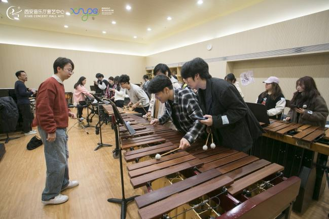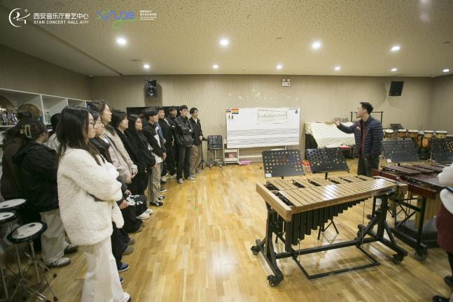 随后的研学体验环节将活动推向了高潮。同学们被分为四个小组,依次进入不同教室,参与了一系列别开生面的特色音乐体验课程。在西安音乐厅青少年打击乐团艺术总监、教学总监、西安交响乐团定音鼓首席杨帆,以及彭小冬主任的引领下,同学们沉浸于打击乐与奥尔夫音乐的奇妙世界。梁帆、张玮琛、屈琳妍三位青少年打击乐团讲师为各小组进行了细致的分组教学,通过互动与实践,让同学们亲身感受到了节奏的律动与集体音乐创作的乐趣,现场气氛热烈,欢声笑语不断。