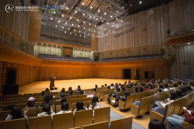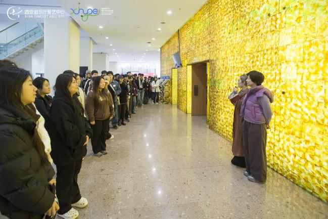 活动伊始,西安奥尔夫音乐教育研究中心主任彭小冬为同学们介绍了本次活动的流程及项目安排,西安音乐厅爱艺中心副校长尹怡帆热情接待了到访的师生,并亲自带领大家进行参观。在尹校长的细致讲解中,同学们漫步于音乐厅内部,欣赏了标志性的金色琉璃墙,感受其蕴含的古典与现代交融的建筑美学;步入庄重恢宏的演奏大厅,同学们亲身感受到了顶级专业音乐场馆的艺术魅力。尹校长还为大家介绍了西安音乐厅的历史背景与发展历程,使同学们对这座西安的文化地标有了更为立体和深入的了解。