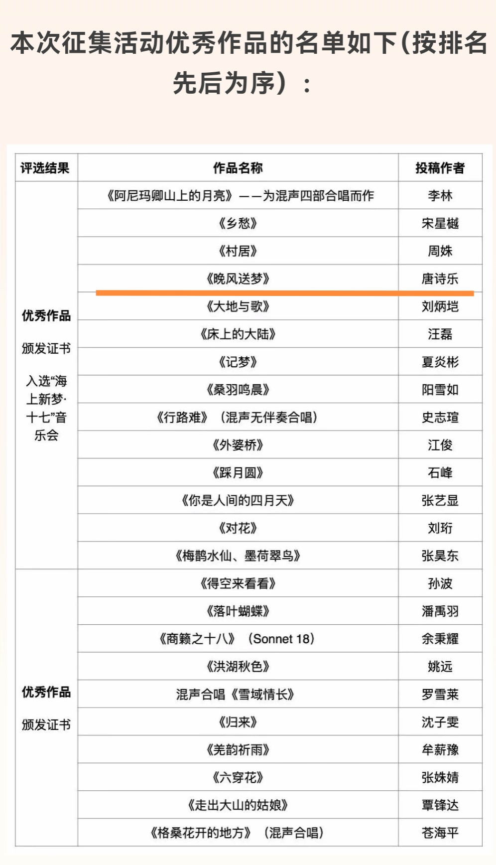 由唐诗乐独立完成作词、作曲创作、编配到录制的《晚风送梦》,描绘了富有童真与乡土情怀的夜景意境。该作品在评选中脱颖而出,展现了其扎实的创作能力。